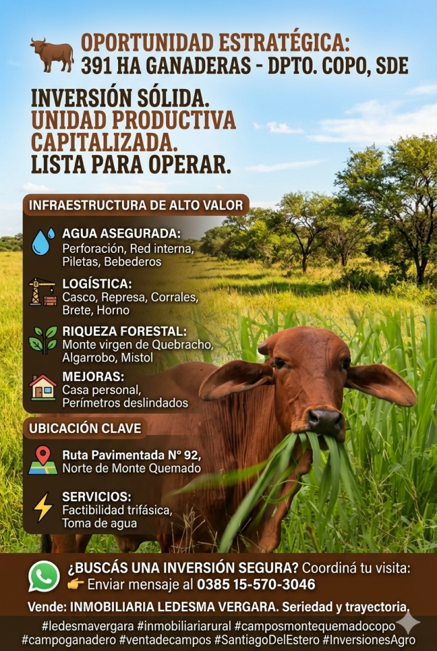 #ledesmavergara #inmobiliariarural #camposmontequemadocopo #campoganadero #ventadecampos #SantiagoDelEstero #InversionesAgro
